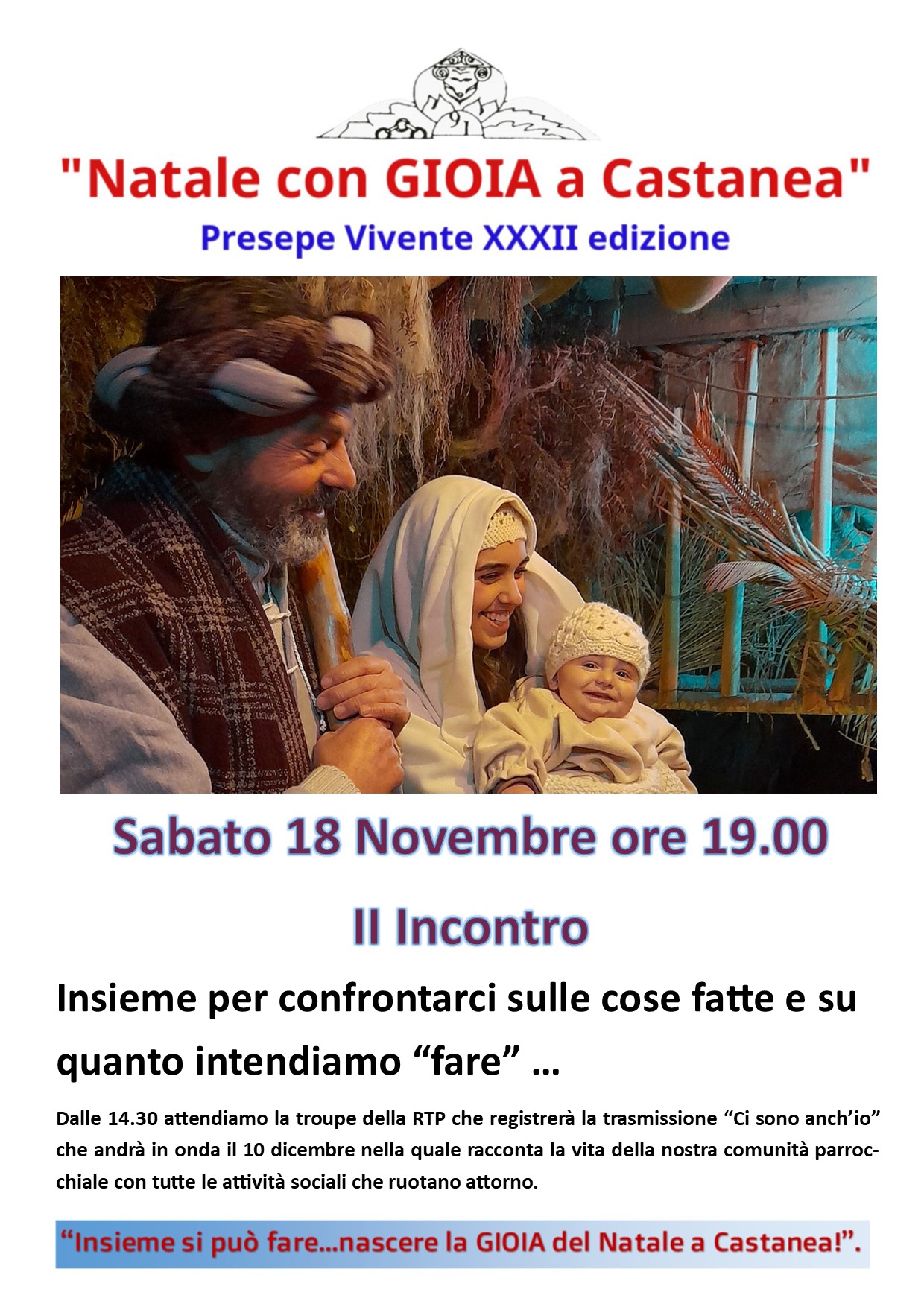 Anno dopo anno proviamo a rendere il “nostro fare presepe” sempre più verosimile e possiamo fare ancora tanto, non c’è mai fine. Lo sguardo sull’anno trascorso e anche più indietro ci mostra una rappresentazione diversa. In verità siamo noi diversi, siamo noi che percorrendo la nostra quotidianità ci trasformiamo attimo dopo attimo ma dobbiamo tenere sempre a mente che il nostro obiettivo resta solo ed esclusivamente: la GIOIA del Natale a Castanea. Ogni edizione è un’impresa ardua, un miracolo che si compie, perché ognuno di noi nella misura in cui può si mette in gioco liberamente. La scommessa più grande è proprio quella di viversi la GIOIA dentro di sé e nutrirsi vicendevolmente con gli altri, tutti gli altri, figuranti, organizzatori, volontari, visitatori!