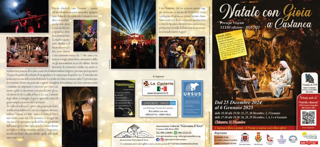 «Pellegrini di speranza!»: è il motto per l’Anno Santo che papa Francesco apre con questo Natale 2024 e Tu, caro Visitatore, puoi fare la tua esperienza come «pellegrino di speranza», visitando il nostro presepe vivente nella Betlemme che la famiglia Arrigo da anni offre a Castanea!
