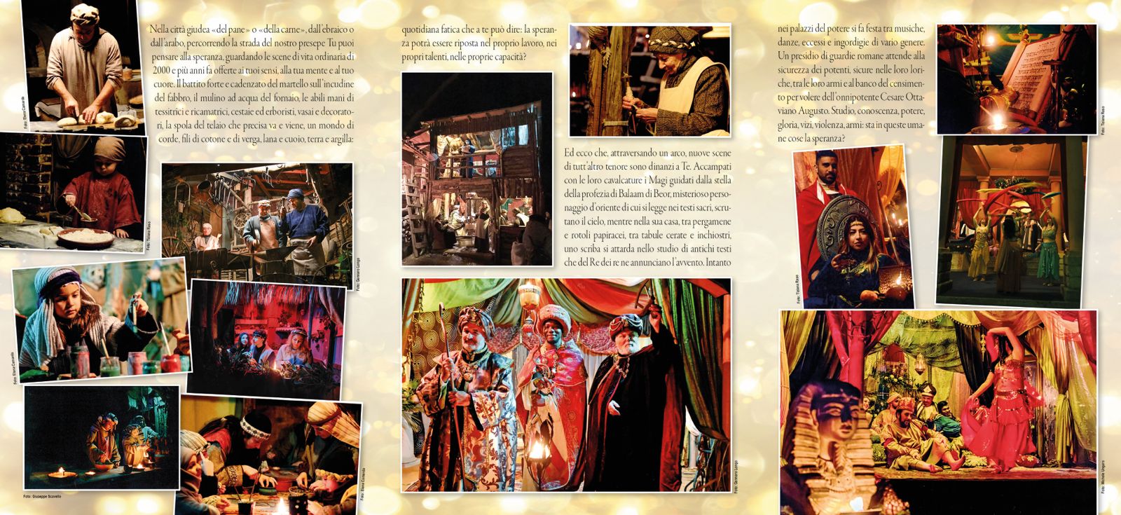 Nella città giudea «del pane» o «della carne», dall’ebraico o dall’arabo, percorrendo la strada del nostro presepe Tu puoi pensare alla speranza, guardando le scene di vita ordinaria di 2000 e più anni fa offerte ai tuoi sensi, alla tua mente e al tuo cuore. Il battito forte e cadenzato del martello sull’incudine del fabbro, il mulino ad acqua del fornaio, le abili mani di tessitrici e ricamatrici, cestaie ed erboristi, vasai e decoratori, la spola del telaio che precisa va e viene, un mondo di corde, fili di cotone e di verga, lana e cuoio, terra e argilla: quotidiana fatica che può dire a Te la speranza riposta nel proprio lavoro, nei propri talenti, nelle proprie capacità.